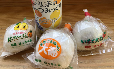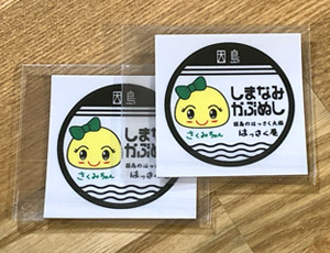 今回はっさく屋の店内で初めて食事をした。はっさく大福・いちご大福・まるごとみかん大福・フルーツミックスジュースを買って、因島大橋が目の前に見える窓際のカウンター席に座っておやつタイム。初めて食べるまるごとみかん大福は、名前の通り小さいみかんがそのまま大福生地に包まれていた。どの大福も美味しいが、はっさくの酸味と大福の甘みが妙にマッチしたはっさく大福がやっぱり一番美味しい。グッズ販売コーナーを覗いたらかわいいシールが目に留まり、何だかとても自転車に貼りたくなって2枚購入。 |