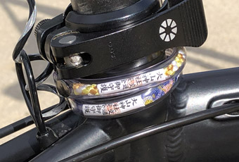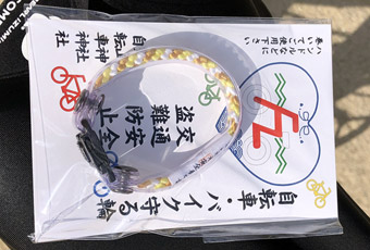 今回のサイクリング一番の目的である自転車神社のお守り「自転車・バイク守る輪」を社務所で購入。K9Xはアヒルバルブキャップとフロントバッグの黄色が差し色的なアクセントになっているので、黄色い御守りを追加装備したいと思っていた。自転車・バイク守る輪は10種類以上あり、反射材が入ったタイプの紐で蛍光色っぽい目立つ黄色の御守りがあったが、それよりも御洒落な感じで黄・橙・白の3色入った組紐タイプの御守りを選んだ。7ヶ月前に買った青いちりめん紐の御守りを付けているシートクランプ下に、ふたつの御守りが重ならないよう上下並べて装着。これでご利益は2倍!もう落車も自転車盗難の心配も無し!…とはいかない。 |