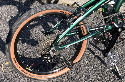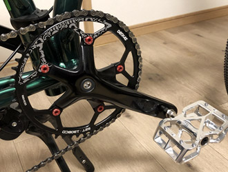 期待通りアメサイドタイヤに変更してガラッと印象が変わった。深みのあるメタリックグリーンのフレームカラーとアメサイドの色合いがよく似合っていて、視覚的インパクトが大幅アップ。ブロックパターンも存在感アップに貢献している。バイオコルクグリップも黒色で統一されたハンドル周りのいいアクセントになっている。加えてハイポリッシュのペダルとチタニウムグレーのシートポストも質感が良く高級感が増した。いかにもカスタムパーツっぽいチェーンリングもイイ感じだ。 |