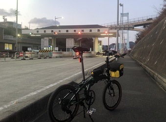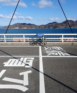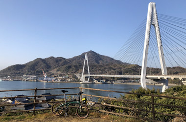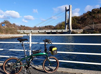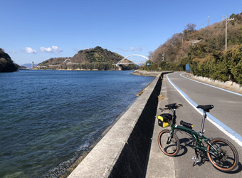 生口島の海沿い道路を暫く走り、緩い上り坂が続く自転車・歩行者道に入って生口橋に上がり、橋を渡って因島に入る。そして目的の自転車神社へ行く前にはっさく屋へ向かう。真冬の朝という事でサイクリストの姿はここまで一切見掛けず。自分も去年までは真冬にサイクリングをするなんて考えられなかった。寒がりなのによく成長したなと自分に感心。 |
