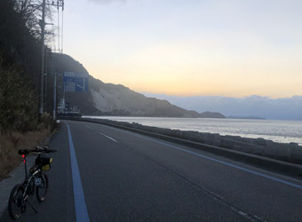 須波港に着いた時の気温は−1℃で、沢港からのスタート時も多分0〜1℃くらい。それでも無風なのでそれほど寒いとは感じない。冬場のサイクリングは風の有無が特に重要だと改めて実感。天気予報ではこの日の風速が1〜2mとなっていたので気温が低くても決行したが、風速5m前後とかだったら中止していたと思う。海沿いサイクリングは特に風の影響を強く受けるので厄介だ。 |