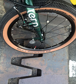 ルックスに関しては大満足なグラベル風カスタムだが、走り始めから直ぐに感じたのが乗り心地の良さ。BILLY BONKERSのブロックパターンがいいクッションになっているようで、段差や橋の繋ぎ目などのギャップ通過時や、ガタガタした石畳や路面状態の悪い道の通行など、突き上げ感や振動がマイルドで快適性が高い。ゴロゴロした走行音が最初は耳に付いたが直ぐに慣れて気にならなくなった。ブロックパターンは地面に溜まった砂や雨水を拾って跳ね散らかす…なんてデメリットがありそうだが、路面状態の悪い場所でも安心&快適なのは大きなメリット。 |