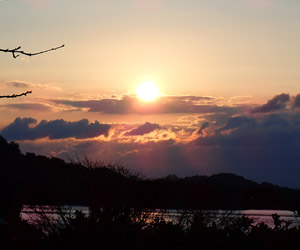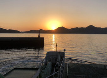 当日の天気予報は晴れ時々曇り。しかし最近の予報は全くアテにならない。予報には雨マークが無いのに雨が降ったり雪が降ったりする事が度々ある。それでも天気予報に頼るしかなく、アテにならない予報を当てにして出掛ける。すると早朝は雲ひとつない快晴で、須波港からフェリーに乗船すると同時に向かいにある島の陰から日の出。これまでの経験上大抵早朝は東の空に雲が掛かっているが、今回はどの方角も雲ひとつないスッキリした晴れ空だった。こんな時に限って水平線からの日の出を見られる場所にいなかった事が本当に惜しい。 |