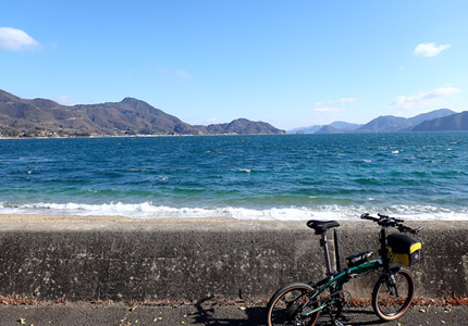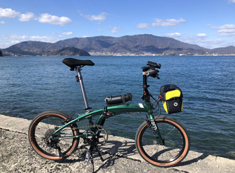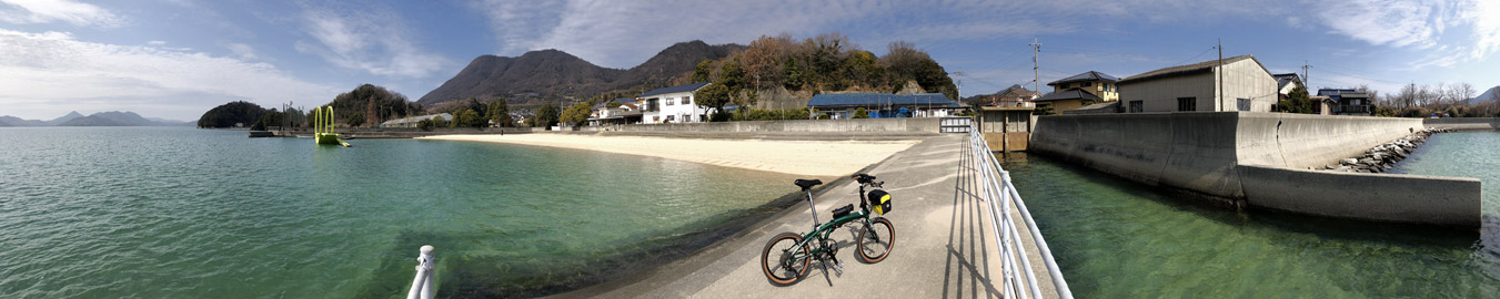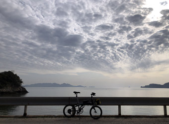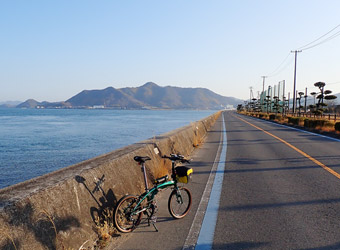 生口島の沢港から因島へ向けて7:50サイクリングスタート。まだ低い朝日の陽光を浴びながらのんびり走る。朝日が周囲を黄金色に照らしているうちが愛車N8のベスト撮影タイムという事で、ちょくちょく脚を止めては海を背景にして写真撮影。我ながらメタリックグリーンのフレームとアメサイドタイヤの色合わせはセンスがあると思う。 |
