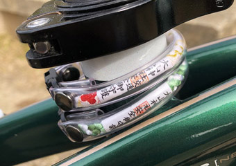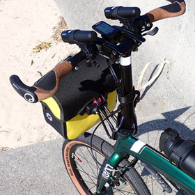 グラベル風カスタムを施したN8にはどのフロントバッグを装着しようかサイクリング当日まで迷ったが、一番サイズが小さく一番スポーティな見た目のORTLIEBにした。メタリックグリーンフレーム&アメサイドタイヤのN8に鮮やかな原色イエローのバッグは正直微妙かな…というのが自宅での感想だったが、日差しのある外で見たら特に違和感は無かった。むしろ色もデザインもグラベル風N8にマッチしてイイ感じにまとまっていると思う。こういうパーツは実際に装着してみて、かつ製品本来の色で見られる明るい場所で確認しないと分からないものだなと思った。 |