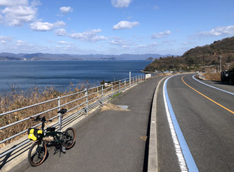 風は弱まったとは言え断続的に吹き続け、しかも何故かほぼずっと向かい風な気がする。進行方向の方角が変わってもずっと向かい風に吹かれている気がする。まぁ、往路も復路も向かい風というのはとびしま海道サイクリングあるあるだ(自分だけ?)。向かい風の空気抵抗と寒さが少々しんどいが、気持ちのいい冬晴れで彩度の高い瀬戸内風景が視界に広がり気分はいい。 |