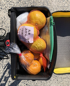 今回装着のフロントバッグは買い物サイクリング向けのGO-TO BAGではなく、手持ちのバッグで一番容量の小さいORTLIEBバッグ。それでも補給食のコンビニおにぎり3個を食べたら容量に余裕ができたので、復路で通り掛かった2ヶ所の無人販売所でミカン購入。手持ちで一番小さいと言っても容量は7リットルあり、携帯工具・携帯ポンプ・スペアチューブ・パンク修理剤(液体ゴムを重鎮するヤツ)…等々の自転車用具に加えてデジカメ用三脚やチェーンキーも常時入れてあり、それプラス補給食などの食べ物もそれなりに入るので優秀だ。やっぱりフロントバッグは便利でいい。 |
