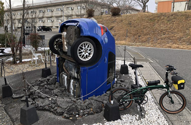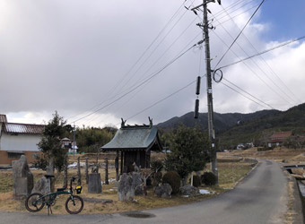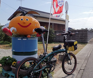 はっさく屋を出ると空一面に雲が広がっていて、日差しは遮られ体感温度はガクンと低下。ほんの少し前までは雲ひとつない快晴で、しかもずっとほぼ無風だったのに一体どういことだ。これじゃ晴れ時々曇りじゃなくて晴れのち曇りじゃないか。想定外の急激な空模様の変化に戸惑いつつも、今回のサイクリング一番の目的地である自転車神社へ向かう。 |