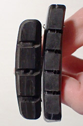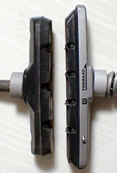 購入したブレーキシューもシマノ製で、リムと接触して消耗する部分だけを交換できるタイプのもの。N8購入時から付いていたものは軸部分から丸ごと交換するタイプなので、その点でもパーツグレードがアップした事になる。本体の色は艶消しシルバー。社外品で真っ赤や真っ白など目立つ色のブレーキシューもあり迷ったが、タイヤのアメサイドと色が馴染まず浮いてしまいそうだし、信頼性も考えてシマノのブレーキシューにした。 |