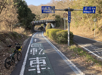 長い上り坂を進んで自転車神社へ向かう |