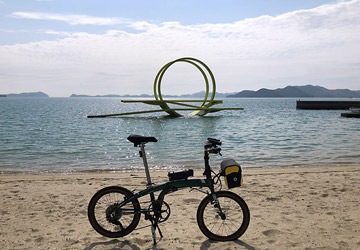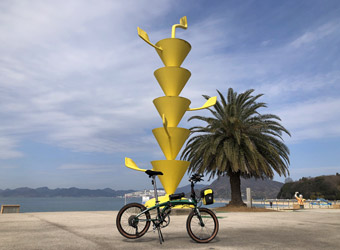 このままサクサク進んで行くと乗船予定の沢港13:30発のフェリーを1時間以上待つことになると途中で気付き、しかしそれよりひとつ早い便だと逆に時間が間に合わず、わざとペースを落として走行。港の待合所で長時間待っていても退屈なだけだ。フェリーを利用して島へ渡る場合は行きも帰りも出航時間を考えて行動しないといけないのがちょっと煩わしい。時間潰しも兼ねて生口島に点在する”島ごと美術館”のオブジェなどにチマチマと寄り道し、プチ観光を楽しみながらのんびり進んでいく。 |