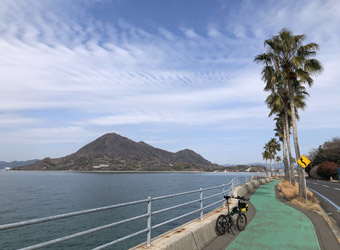 自転車神社の後は再び生口橋を渡って生口島まで戻る。ここまでは2ヶ月前に職場の同僚と全く同じルートを走ったが、その時は強い風が吹いていて寒いしペダルが重いしで生口島一周を断念した。今回はほぼ無風なので生口島を一周。 |