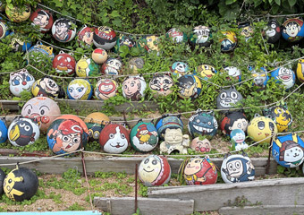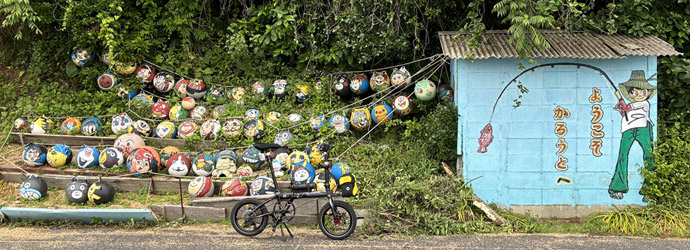 鹿島北端から鹿島大橋を渡って倉橋島に入り、倉橋島南端に位置する地区の鹿老渡で沢山のブイアートを発見。鹿老渡を通るサイクリングはこれが3度目になるが、このブイアートに今回初めて気付いた。過去2度は晴れだったので反対の海側に目を取られていたのかも知れない。そう考えれば今回の曇天サイクリングも全く無駄ではないと思える、そういう事にしておく。 |