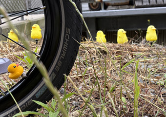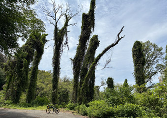 雨水や植物でタイヤが汚れるのはまぁ仕方がないとして、今回のサイクリングでとにかく厄介だったのが毛虫。繁殖時期なのか路上の至る所に毛虫がいた。毛虫は絶対踏みたくないのでいつも以上に路面状況を注視して走る必要があった。道路沿いの木から蜘蛛の糸?で吊された毛虫も多いので、上も気を許すわけには行かない。 |