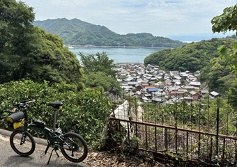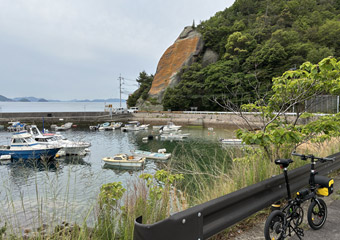 次は何処を散策しようかと考えながら、とりあえず豊島まで進もうと豊島大橋を渡っている時に、目の前にある豊島の山を見て次の目的地が決定。豊島の最高峰である十文字山の山頂にある展望台を目指す事にした。機会があれば(やる気が出れば)小径車で十文字山ヒルクライムに挑戦してみたいという考えが前々から頭の片隅にあって、今回豊島の山を目の当たりにしてふとやる気になった。という事でゆるポタからのヒルクライムに急遽移行。 |