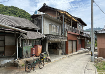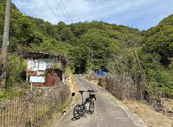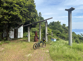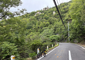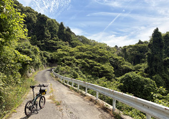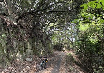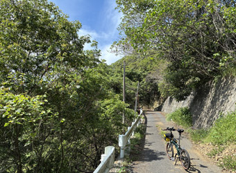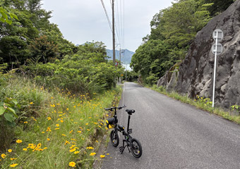 路面には枝葉が散乱していて所々で小規模な落石もあり、常に路面の状態と周囲の状況に注視しつつ走らないといけない。そんな山道を淡々とペダルを漕いで進んで行く。ついさっきまではゆるポタ気分で瀬戸内風景を満喫していたというのに、一転風景が閉ざされた山道をひたすら登る体力勝負のサイクリングになってしまった。まぁそれでも自由気ままなサイクリングである事には違いない。事前に走行ルートや目的地を決めずに行き当たりばったりで走るのも楽しい。 |