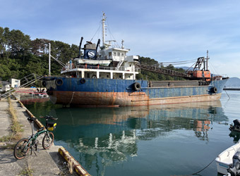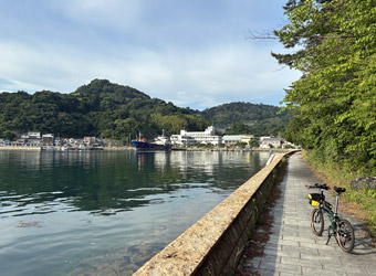 途中から江田島の南端にそびえる陀峯山が対岸に見えるようになり、石切り場として削り取られた山肌が印象的な光景。そんな風景を眺めながらまったりペダルを漕いでゆっくり進んで行き、石運船が接岸する港がある集落や牡蠣の養殖場がある集落を通過。そしてマイカーを駐めたパーキングに帰着。 |