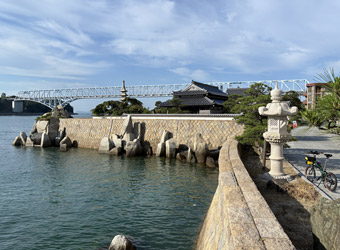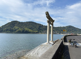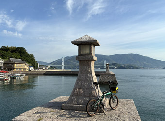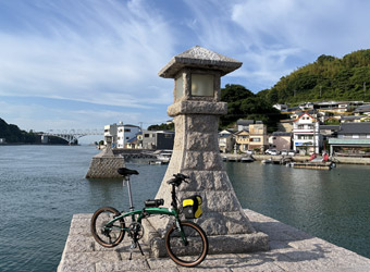 せっかくなので反対側の防波堤にも行ってみる。向いの石灯籠の後ろに安芸灘大橋と野呂山が見えて、こちらからの風景もなかなかいい。走り始めから思わぬ発見をして気分上々。やっぱり散歩感覚でのんびり走った方が色々なものに目が留まり新しい発見に出会える。走行距離や走行時間を目標にするも良し、〇〇一周や〇〇往復など目的・ルートを決めて走るも良し、のんびりポタリングして風景や季節感を満喫するも良し。サイクリングには色々な楽しみ方があるので飽きない。 |