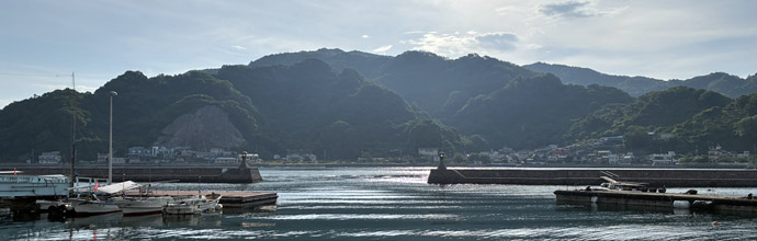 下蒲刈島をのんびりゆっくり走ってふと目についた横道に折れると、小さな漁港を囲む防波堤に出る。何度も走っているとびしま海道で初めての場所発見。防波堤の先端には石灯籠が立っていて、向かいにも同じ石灯籠が立つ防波堤がある。下蒲刈島の町並みや蒲刈大橋が見られてなかなか眺めがいい。 |