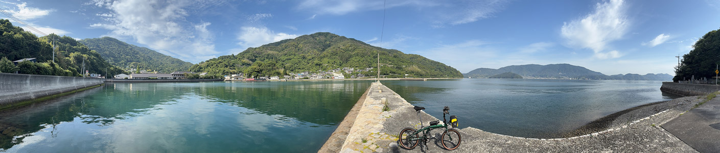 上蒲刈島北岸沿いの道路を進んで行き、お気に入りの桟橋(と言うより防波堤?)にも寄り道。視界いっぱいに長閑な風景が広がり何だかとても落ち着く場所。こういう場所を訪れて曇天だったら損した気分にしかならない。前回の倉橋島&鹿島サイクリングは終始曇天でガッカリだったし、その前のとびしま海道サイクリングも雲が多く微妙な天気だったので、とにかく今回は晴れてくれてよかった。…と天気に満足だったのは前半までで、後半は雲の多い空模様に変化していくのであった。 |