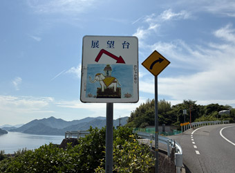 豊島大橋を下りて豊島の外周路を暫く進み、長い上り坂が続く道路に入って途中で「展望台→」と書かれた案内板が立つ横道に折れる。知らない人がこの案内板を見たら軽い気持ちで寄ってみようなんて思うかも知れないが、軽自動車で走るのも気を使う狭小山道。知らずに普通車で入ってしまったら大変な事になる。道幅が非常に狭い事を警告する案内板も必要だと思う。この山道は十文字山の隣にある高雄山の道で、先に高雄山山頂にある空海展望台に寄ってから目的の十文字山展望台へ行く事にした。高雄山側から十文字山展望台へ向かうのは今回が初めて。何気に初めてが多いサイクリングだ。 |