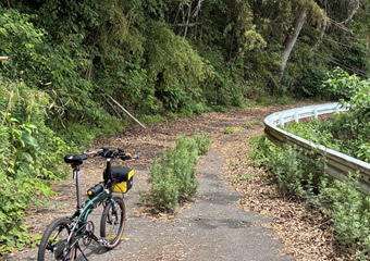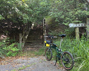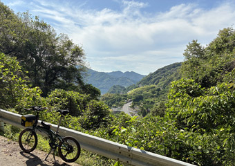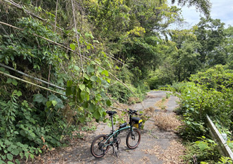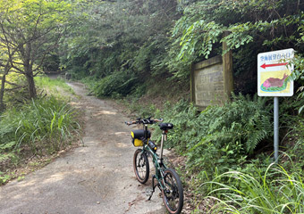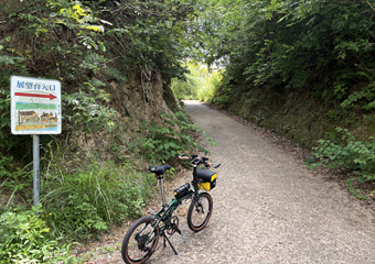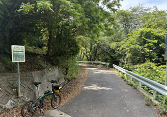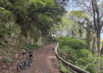 山道はそれなりに急な上り勾配もありそれなりに疲れる道のり。途中でGoogleマップを見て案内板からの進み具合を確認するも、思ったほど進んでいなくて少々気が重くなる。やっぱり小径車で展望台2ヶ所も周るのは欲張りすぎたかなと思いつつも、もう後には引けない所まで進んでしまったので覚悟を決めて(ちょっと大袈裟)空海展望台を目指す。山道はほとんど木々に囲まれていて外の風景は滅多に見られず視覚的に退屈。それと小さな虫が常に顔の周りを飛んで羽音が非常に鬱陶しい。どんだけ手で払っても直ぐにまとわり付いて来るので結構なストレス。6月にもなると木々が茂った場所は虫が多くなるので、暑さだけではなくそのような点でも夏場のヒルクライムは向いていない事を思い出した。 |