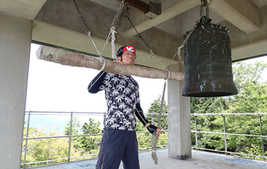 ようやくたどり着いた空海展望台は敷地内に背の高い雑草がぎっしり生い茂り、通路としてゴムマットのようなものが敷かれた部分しか足の踏み場がない状態。そしてぐるっと木々に囲まれとても展望台とは思えない様相。鐘つき堂になっている建物に上がっても木々が邪魔でほんの一部しか外の風景は見えず、ほぼ展望台としての機能を失っている。山道の状態からして展望台もこんなだろうと予想はしていたが、それにしてもあんまりな状態だ。そんな嘆きを込めて鐘をひとつき。 |