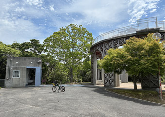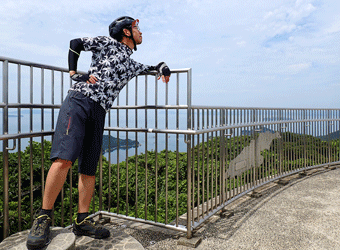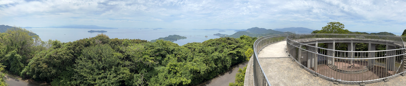円形展望台の上はパノラマ風景が広がっていて、周囲の瀬戸内風景を360°ぐるっと眺望できる。ただ、インパクトは薄く印象に残るような眺めではない。何というか眺めはいいが全く特徴の無い風景という印象。ホームコースであるとびしま海道にありながらもサイクリングで1度しか訪れていなかったのは、ヒルクライムの労力に見合う眺望では無いという理由が大きい。それでも今回ふと行く気になって再訪を果たす事ができたのは良かった。 |