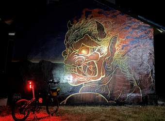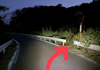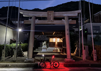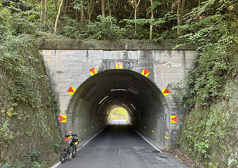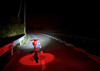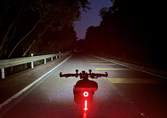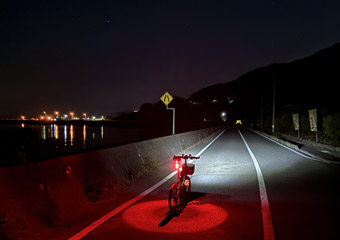 前回は長い上り坂の途中で獣の影が横切りドキッとさせられたが、今回はその坂道を過ぎた先で何とイノシシの親子に遭遇。大人1匹にウリ坊5匹くらいのイノシシ集団が突然目の前に現れてビックリした。イノシシは直ぐに道路脇に逃げて行ったので事なきを得たが。やはり前回の獣の影もイノシシだったに違いない。夜間の江田島ライドはイノシシ注意だ! |