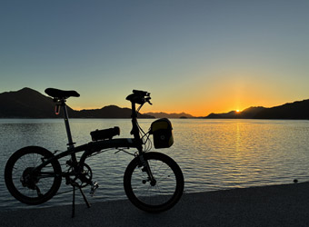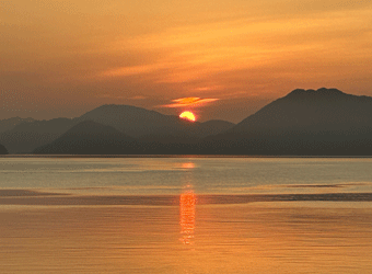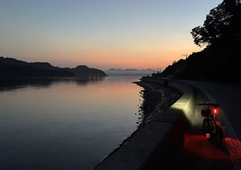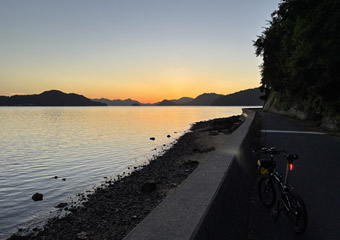 前回より20分ほど早く江田島北西部の北岸に出ると、前回と同じように綺麗な朝焼け風景が広がっていた。ただ、前回の朝焼けは黄金色だったが今回は朱色の朝焼け。同じ風景でも時間帯や天気などによって全く違って見えるので面白い。だから何度同じコースを走ってもサイクリングは楽しい。 |
