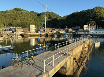 何か些細なものでもいいから新たな発見はないかと思い目に留まったのが、岡村港にある漁港の長い防波堤。自転車に乗ったまま防波堤を進んで行くと、途中で枝分かれするY字形の防波堤になっていた。そして灯台が建つ方の突端まで進んでそこからの風景と写真撮影を楽しむ。こういうちょっとした発見がいつものとびしま海道に新鮮味を与えてくれる。 |