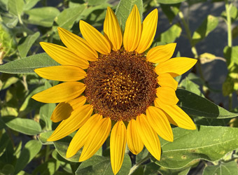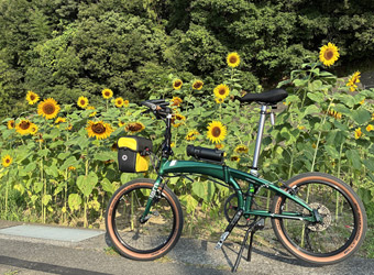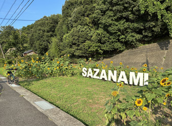 往路で気付いたSAZANAMIモニュメントのヒマワリを復路で見物しようと楽しみにしていたが、日の差さない曇天模様では花も映えないだろうなと残念に思っていた。ところがちょうどSAZANAMIモニュメントに差し掛かるところで厚い雲から太陽が姿を現し、日が差して視界に広がる風景が明るくなる。そして東側以外の空はいつの間にか青空になっていた。 |
