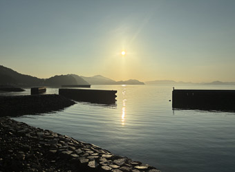この日の日の出時刻は5:30。一番早く日の出を見られそうな岡村島の北端に予定通り日の出時刻丁度に到着。それから5分程してしまなみ海道の大三島の山陰から朝日が姿を現す。快晴ながらもいつも通り東側だけ雲が広がっていたが、くっきり丸い朝日を見ることができて満足。 |