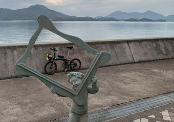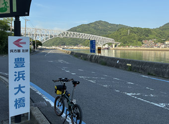 豊島から豊島大橋を渡って上蒲刈島に入ったところで、橋のたもとにある豊島大橋展望台に寄り道。ここは数年前にロードバイクで一度訪れたきりで、ミニベロサイクリングで寄るのは初めて。展望台からは豊島大橋を目の前に見ることができるが早朝は思いっきり逆光だった。それから海岸沿いの道路に下りて上蒲刈島の外周路を時計回りに進む。空腹を覚えるも日陰が無くて食事休憩が出来ず、厳しい日差しと空腹で体力も気力も激しく消耗。 |