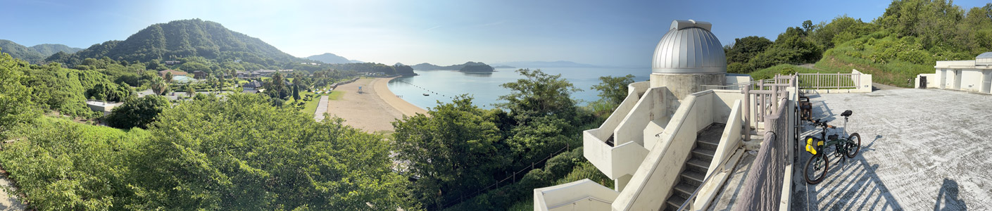 暑さが辛くてとにかく日陰に避難したくて県民の浜の施設内に逃げ込むも、清掃中の人が何人もいて落ち着かないので直ぐ外に出る。そして何を思ったのか高台にある天体観測館へ。県民の浜と周囲の風景を一望できる展望台があるが、身を隠せる日陰など無く容赦なく日差しが照り付ける。もう限界だっ! |
