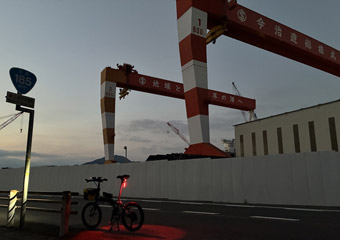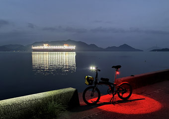 一旦海沿いから離れて長いアップダウンを越えて三原市に入り、再び海沿いに出たところで東の空が明るくなり始めていて雲が多い事を知る。もしかしたら今回は日の出も朝日も見られないかも知れない…と覚悟する。そして竹原で見えたやたらと明るい船が沖に停泊していた。大型客船ではなく貨物船でもタンカーでもなさそうだが、何故あんなに照明を点ける必要があるのか気になる。 |