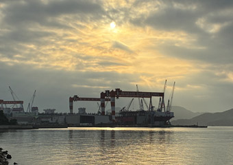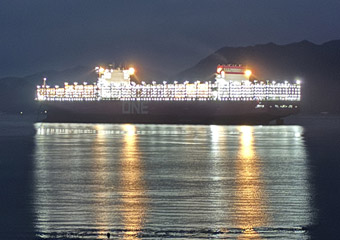 夜間に眩しいくらいの照明を灯していた船の外観を復路で確認。ある程度離れた沖に停泊していても大きな船だと分かるが、何の船かはやっぱり分からず。船体に描かれた「ONE 」で調べたらコンテナ船の会社だったが、この船には照明設備がびっしり付いているしコンテナ船ではなさそう。 |