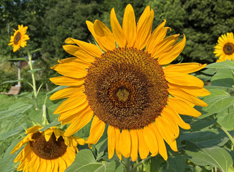 日差しを浴びたヒマワリは鮮やかに発色してとても華やか。タイミング良く太陽が出てきてくれて本当によかった。朝焼けも朝日も見られず気分が下がったままだったが、日差しを浴びた沢山のヒマワリを見ることができて一気に気分は上昇。 |