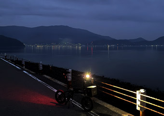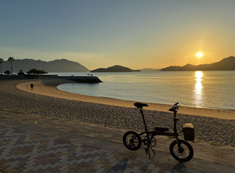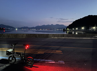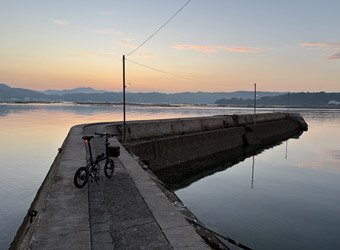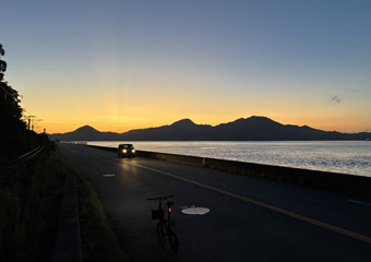 天気予報は晴れ時々曇りと微妙で少し心配だったが、真っ暗な夜空には星が出ていたので一面曇天模様ではないと分かり少し安堵。スタートから5kmほど北へ向けて走って江田島湾の南端に出て、西側の湾沿いに続く道路を進んで目的の日の出スポットへ向かう。そして空が明るくなり始めて朝焼けに染まり、雲の少ない快晴であると分かり一気に気分は上昇。 |
