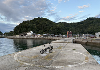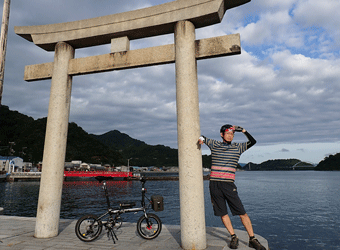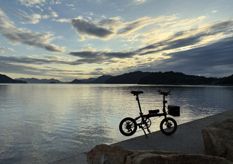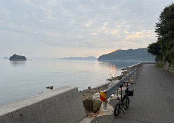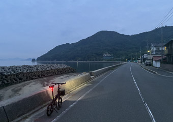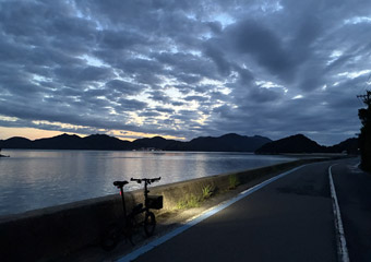 2日後に健康診断が控えているので少しでも身体を動かして体重を減らしたい。という事で、天気予報は微妙でもカロリー消費のためにサイクリング。コースはいつものとびしま海道。2:00起床はもうしんどいので3:00起床の4:20サイクリングスタート。夜明け前から曇りの予報で朝日を見られる可能性は低いと分かっていたが、一応日の出を見るのに良さそうな上蒲刈島北東岸にある日高神社の海岸鳥居を目指して走る。 |