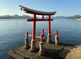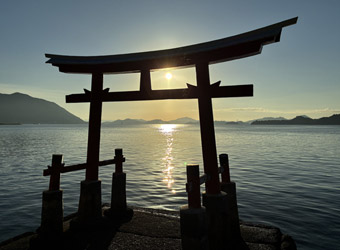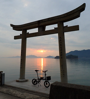 すなみ海浜公園から更に国道を三原方面へ進み、稲荷神社の海中鳥居へ。1ヶ月半前に行なったさざなみ海道サイクリングではここで日の出を見たが、太陽が昇る方角が少々高い山と重なり日の出時刻からだいぶ遅れて朝日が姿を現した事や、鳥居を正面から見ると朝日がだいぶ離れた場所にある点が正直微妙だった。今回は日の出の方角が前回より南側に移動していたのでイイ感じに鳥居と朝日を一緒に撮ることができた。 |