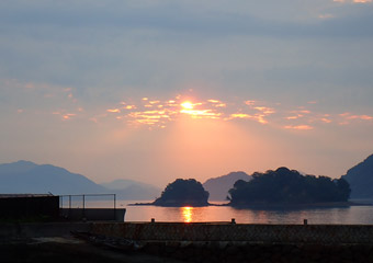 日の出時刻から10分ちょい遅れの5:55に、対岸の江田島北東部の陸地から朝日が姿を現す。今回は文句無しのはっきりくっきりした朝日を見ることができて大満足。太陽の丸い輪郭がはっきり見られるのは日の出からの限られた時間だけだし、特別なものを見られたようで満足感は大きい。 |