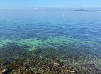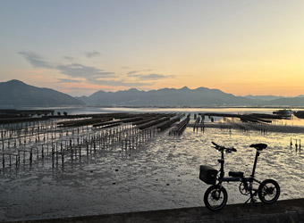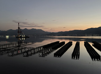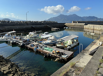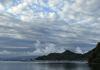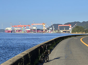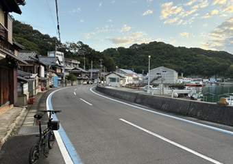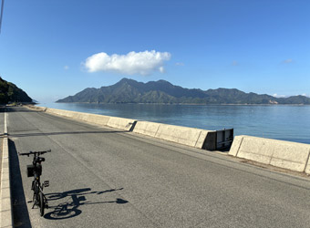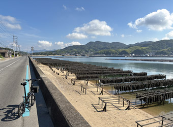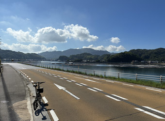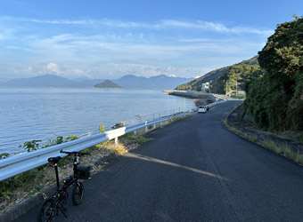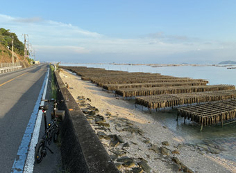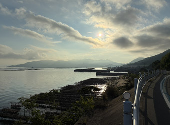 外周路は江田島湾から離れて江田島北西部の北岸に回り込み、今度は西へ向けて進む。朝日を背にして青空が広がる風景を眺めながらのんびりペダルを漕ぎ、たまに朝日を振り返る。海には牡蠣の養殖イカダが沢山ある江田島ならではの風景。とにかく最高に気分がいい。真夏だろうがサイクリングをするなら快晴日に限る!と、これまで以上に強く思った。 |