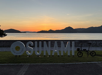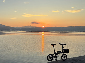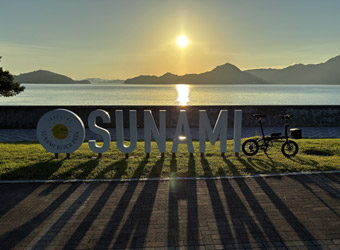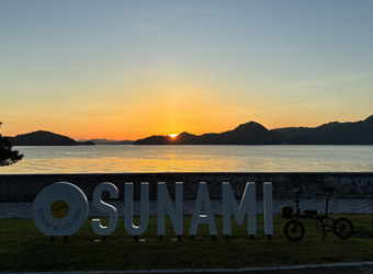 SUNAMIモニュメントの前で向かいの佐木島の陰から朝日が姿を現すのをじっと待ち、そして5:52に日の出を観測。無事3週間前のリベンジを果たすことができ、前週の江田島逆走サイクリングに続いて2週連続で満足のいく日の出を見ることができて感無量。 |