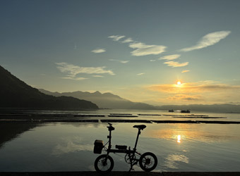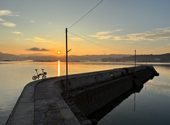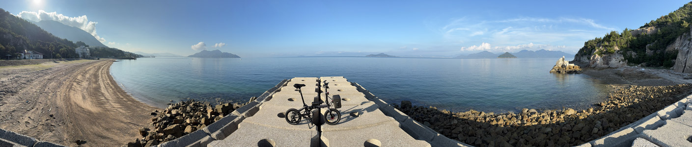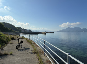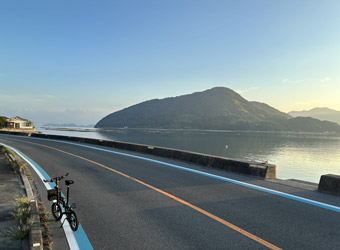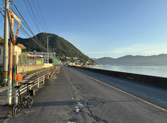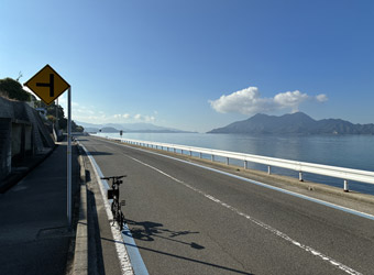 防波堤から朝日のある風景を十分満喫したところでサイクリング再開。江田島湾西岸沿いの県道を北へ向けて進む。道路から見る江田島湾の風景もとても綺麗で、ちょくちょく脚を止めては朝日のある風景を撮影。曇天と快晴ではサイクリングの楽しさに雲泥の差が出ると改めて実感。もう快晴の日にしか走りたくない!と思った。 |