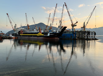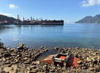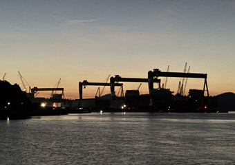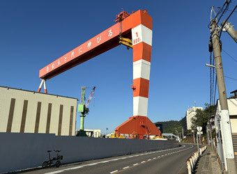 漁港を囲む「く」の字に曲がった2つの防波堤のうち、南側の方には日の出を待っていると思われる先客が既にいた。なので自分は北側の防波堤へ。防波堤の左手には直ぐ側に造船所があり沢山のクレーンが伸びていて、それが海面に映り込んでいるのが何だか印象的。そして右手には漁港に停泊する複数の漁船。朝焼けが広がる水辺というロケーションも相まって妙に風情を感じるいい場所。ここを日の出スポットに選んで正解だった。 |
