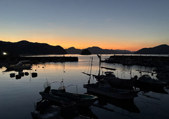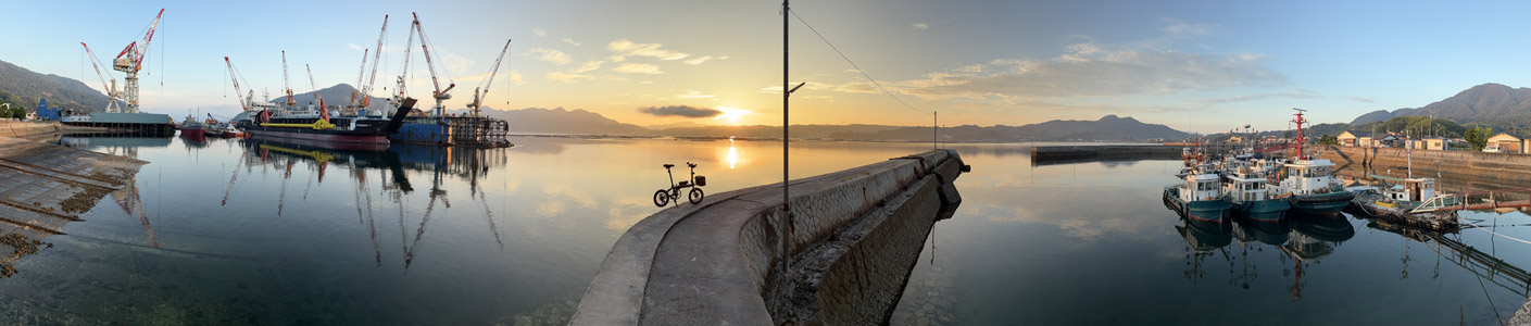 日の出時刻より約10分早い5:35に目的地の防波堤に到着。江田島の海岸で水平線から出る朝日を見るのは不可能(直ぐ対岸に本土があり山々が邪魔)なので、それなら7月の江田島サイクリングで綺麗な朝日を見られた江田島湾でまた見よう、という考えに至った。で、太陽が姿を現す江田島北東部の陸地から一番距離を取れる江田島湾西岸側で、のんびり落ち着いて日の出を見られそうな場所として目を付けたのが、湾沿いに延びる県道から外れた場所にある小さな漁港の防波堤。 |