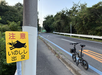 やがて外周路は西岸に回り込み、アップダウンが続く細道区間に入り南下して行く。ここからは夜明け前スタートの時計回りだと夜間走行になるので、周囲の様子がはっきり分かる明るい時間に走るのは久しぶり。少し前にこの区間でイノシシ親子に遭遇してビックリしたが、片側1車線からセンターライン無しの細道になる所にイノシシ出没注意の看板があった。大人のイノシシに突撃されたら自転車乗りなどひとたまりもないので注意したい。 |