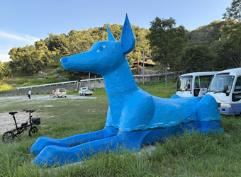 せっかくの快晴なのでもっと沢山綺麗な風景を満喫したいと思い、外周路から少し外れた場所にある入鹿海岸に寄り道。以前快晴日に訪れて印象に残ったビーチだが、朝早い時間はまだ砂浜が日陰になっていた。それにしてもビーチの入り口にある青い動物の像は何だろう。一体何が狙いでここに置かれているのか気になる。 |