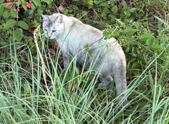 消波ブロックから引き返す途中、雑草が生い茂る中で白い猫がウロウロしていたので少しの間観察。そして青い動物の像まで戻ると砂浜全体に日が差していた。時間は8:00になるところでまだ人の姿はほとんど無いが、これから海水浴やマリンスポーツをしに行楽客がやってくると思われ。現状サイクリングしか楽しみのない自分には海を楽しむ人がリア充している"陽キャ"に見える。そう、自分は単独行動を好む"陰キャ"サイクリストなのである。 |
